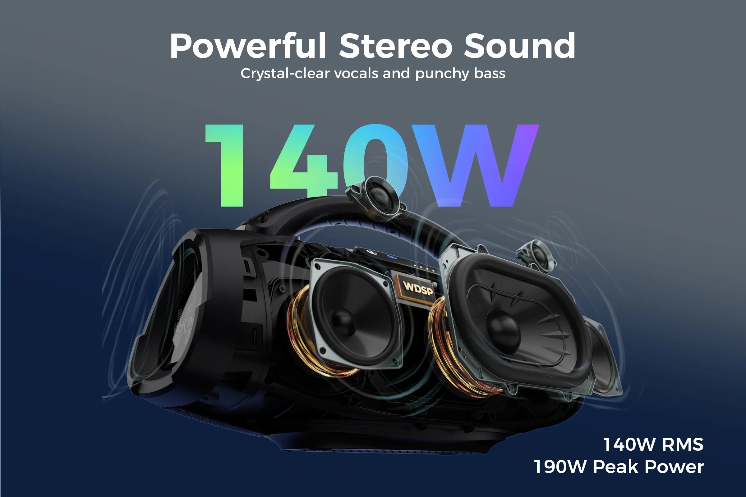 Experience studio-grade sound with 140W RMS (190W Peak) power. Our W-DSP 2.0 technology delivers crystal-clear vocals, thunderous bass, and immersive stereo, turning any space into a live concert.