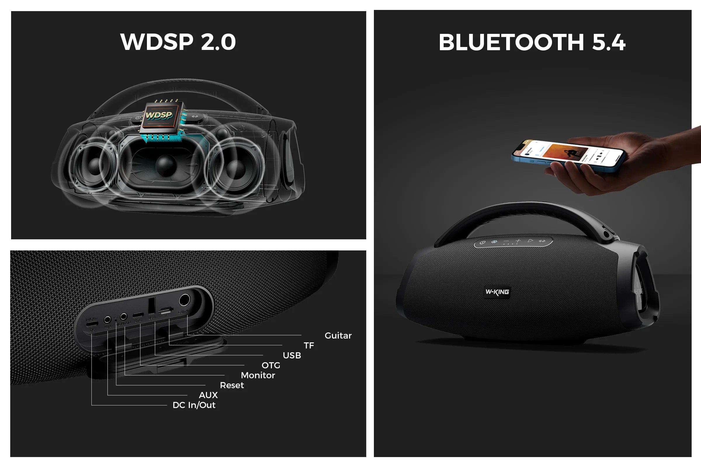 Powered by W-DSP 2.0 for optimized sound, plus Bluetooth 5.4, AUX, USB, TF card, and guitar input. Connect any device, customize your sound, and enjoy endless playback options for every use case.