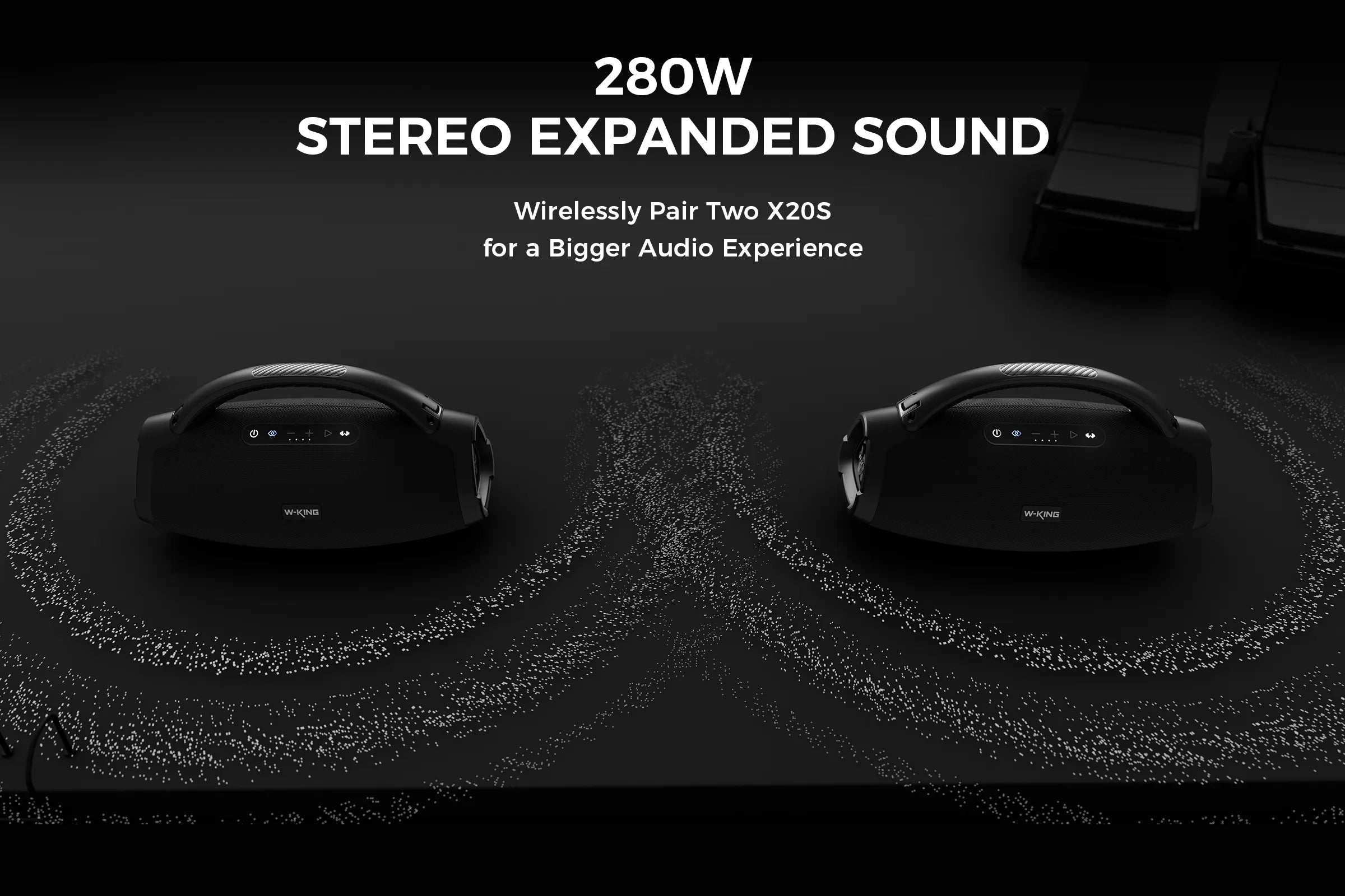 Wirelessly pair two X20S speakers to unlock 280W of expanded stereo sound. Create a true surround-sound experience for parties, outdoor gatherings, or home entertainment, with seamless sync and zero lag.
