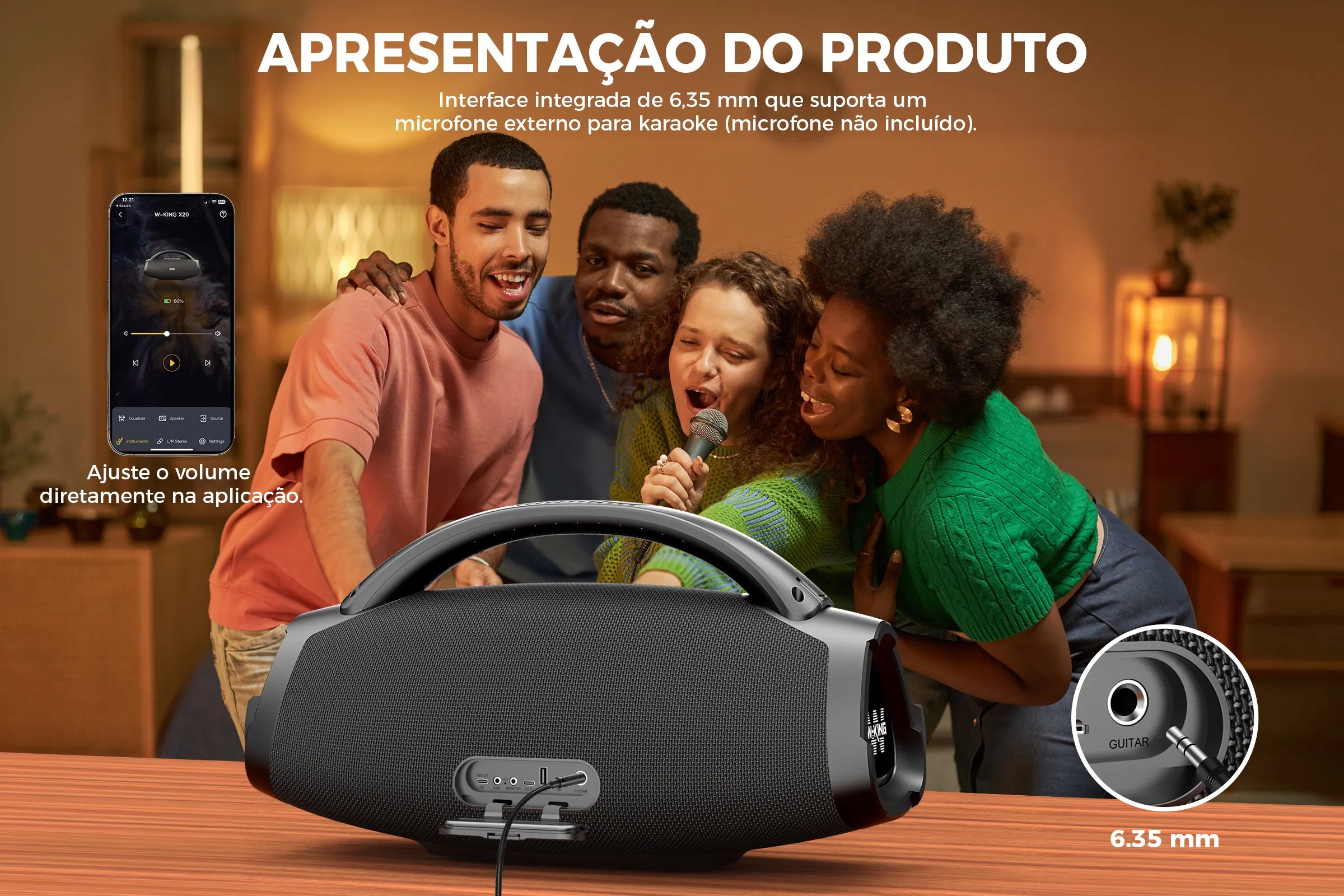 Built-in 6.35mm mic/guitar input turns the X20S into your personal karaoke machine. Control volume, EQ, and settings directly from the W-KING app, for a fully customizable audio experience anytime, anywhere.