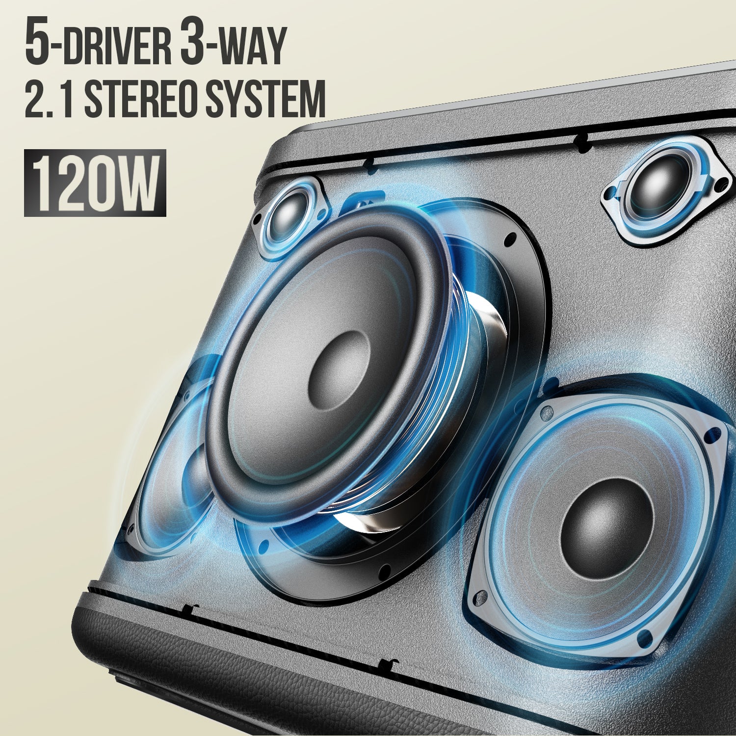 150W Peak Sound with 5-Driver 2.1 Stereo