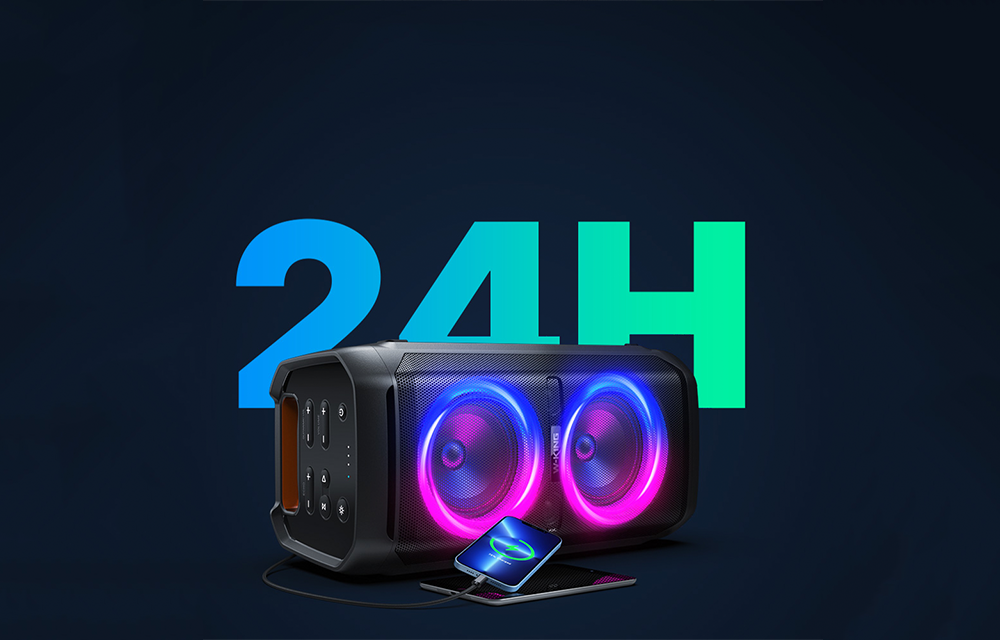 Its rugged body resists water with an IPX6 rating, while the high-capacity battery fuels up to 24 hours of uninterrupted play.