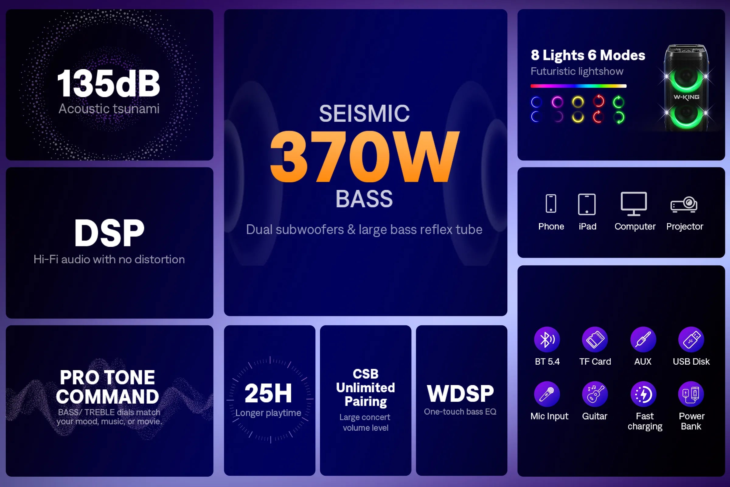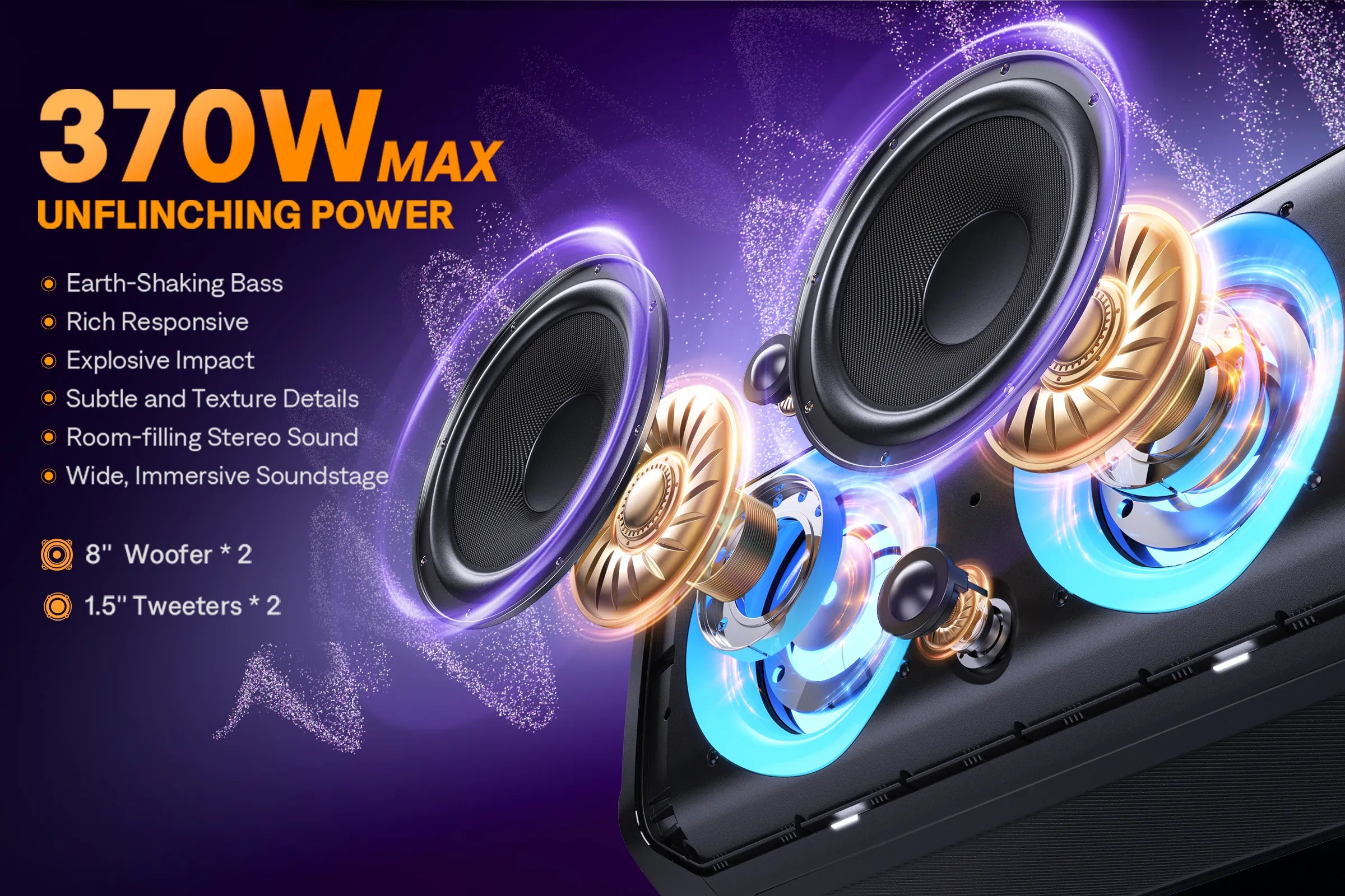 Experience true party-level sound with massive 370W peak power and dual 8-inch woofers. Every beat hits harder, deeper, and louder—designed to fill large spaces with immersive, distortion-free bass.