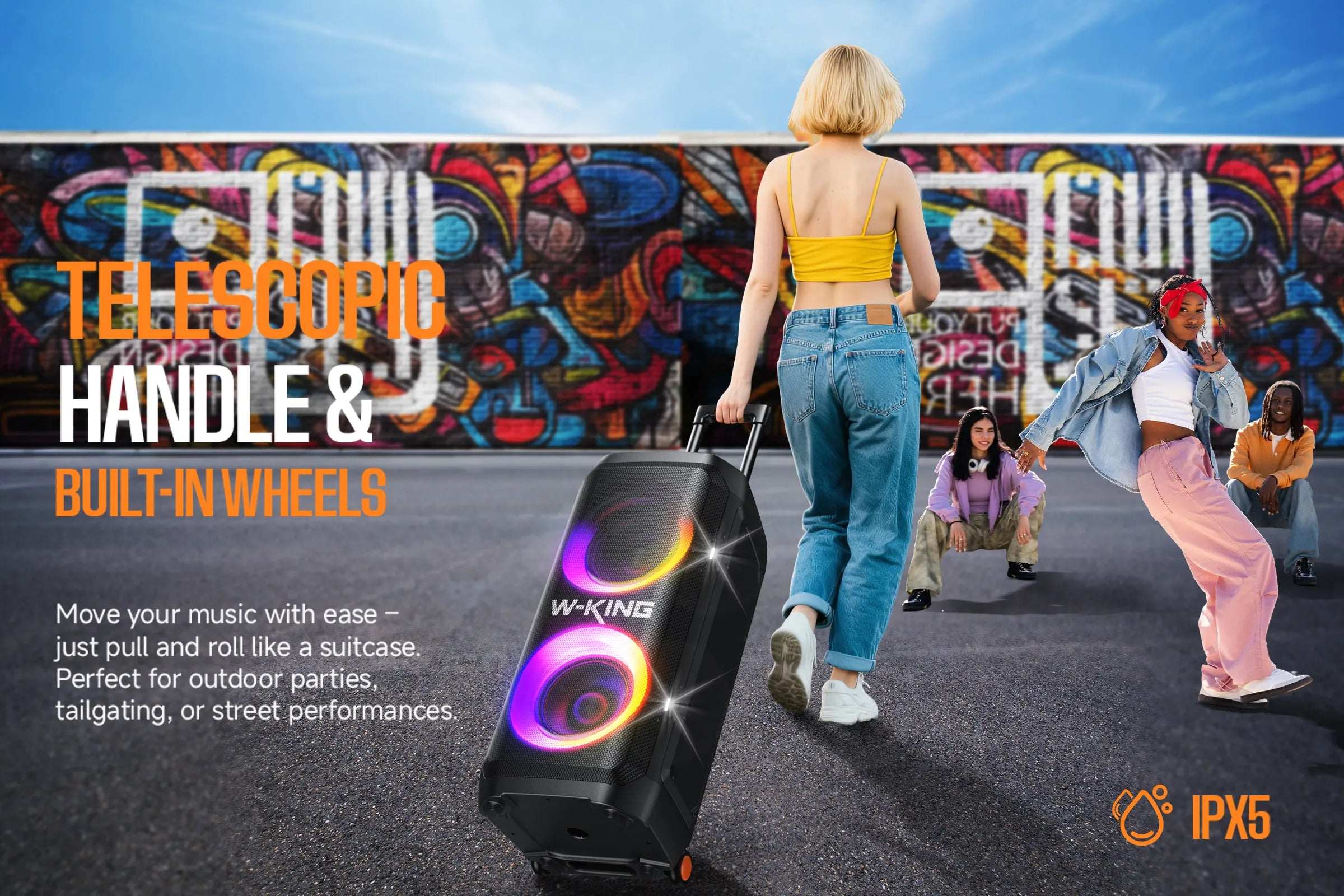 Designed for mobility, this speaker features smooth-rolling wheels and a retractable handle, making it easy to take powerful sound wherever the party goes.