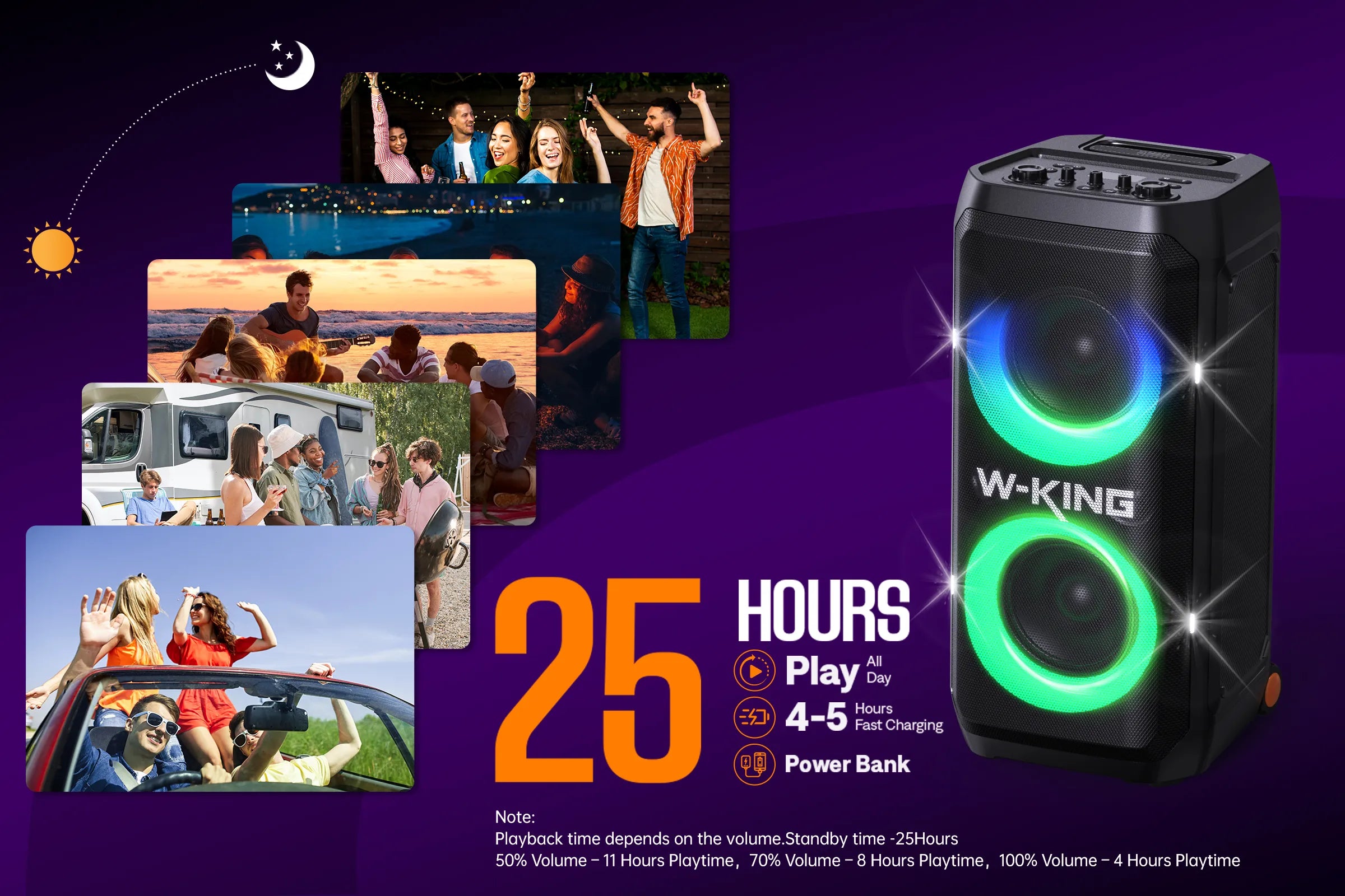 Keep the music going from day to night with long-lasting battery performance. Perfect for outdoor parties, camping trips, or events where power outlets aren’t an option.