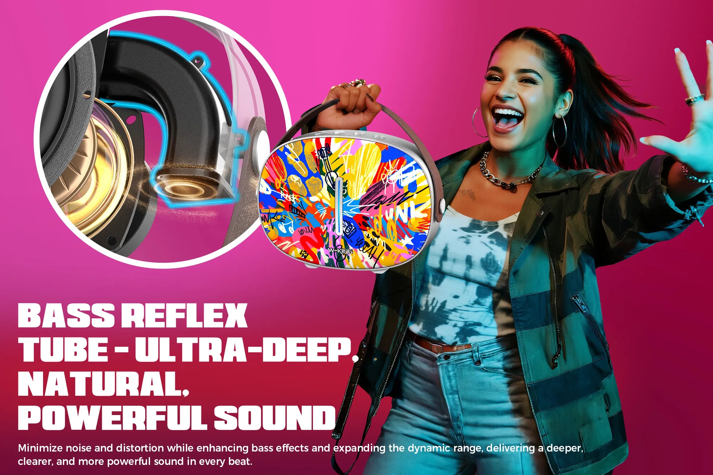 The rear bass reflex tube guides airflow to boost low-frequency depth and rebound power, packing rich, room-shaking bass into a compact body. It fills any space with thunderous low-end, making it perfect for outdoor adventures and bass-heavy music genres like EDM, hip-hop, and rock.