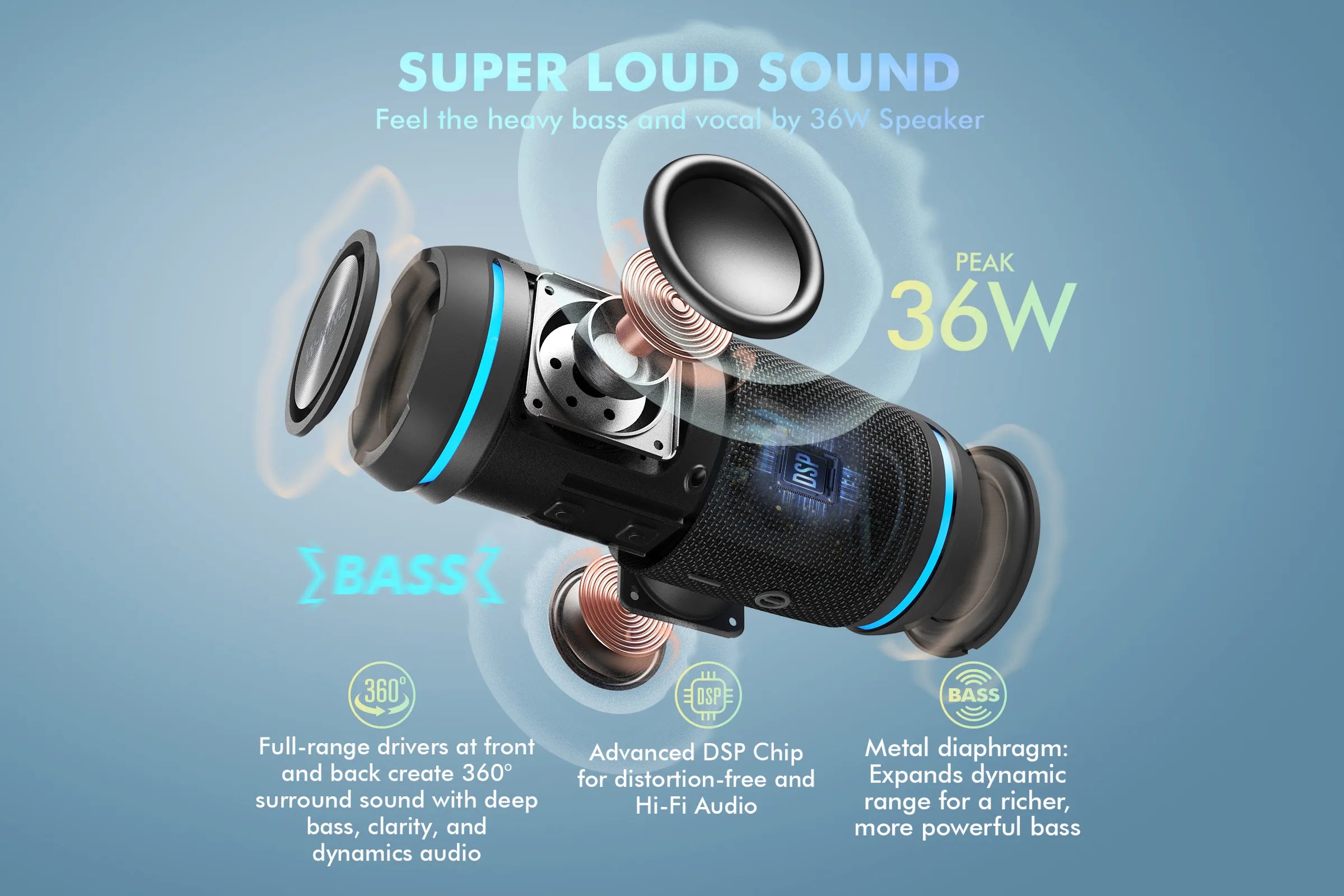 36W high output with advanced DSP chip. Enjoy rich bass and distortion-free stereo sound for music, movies and parties.