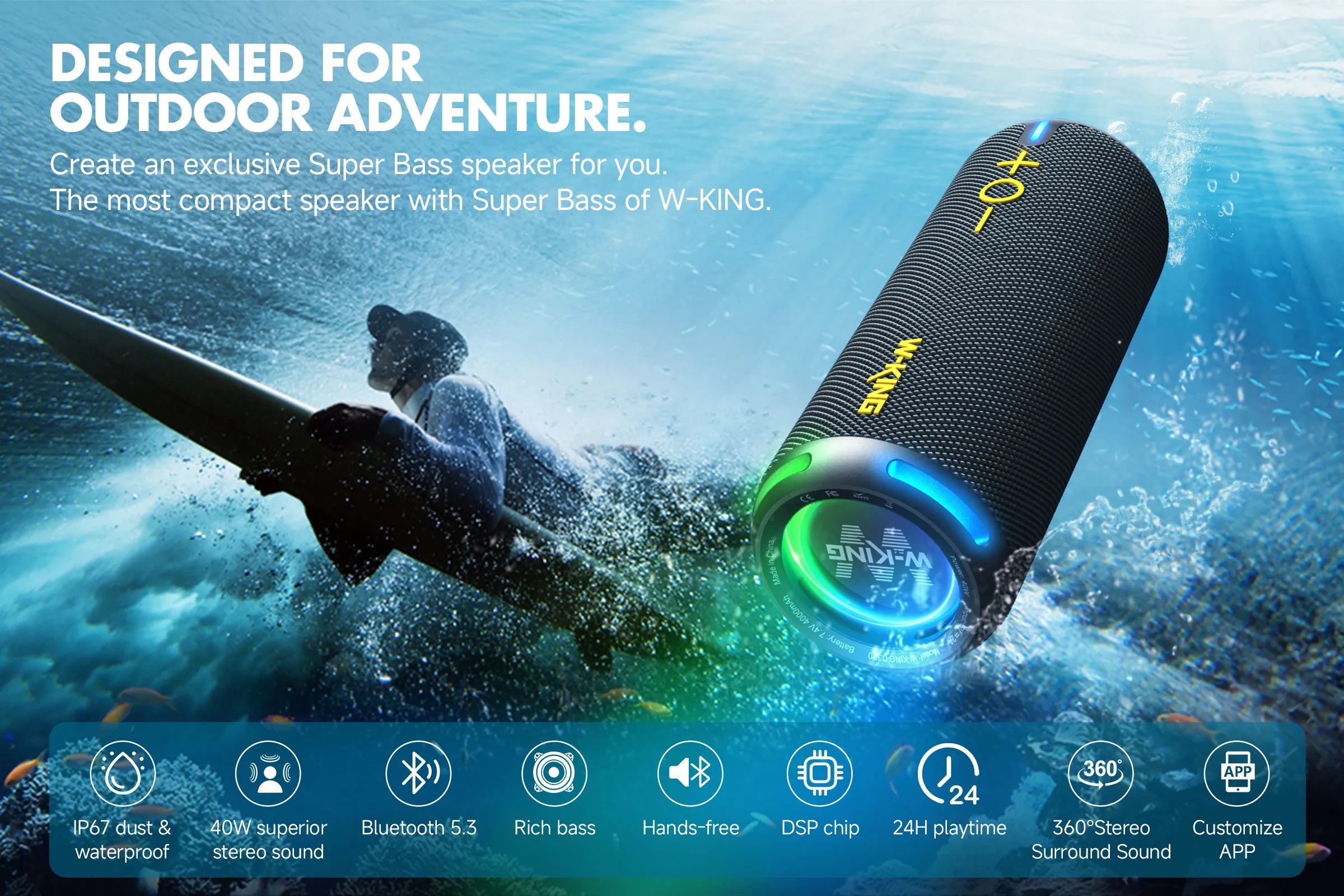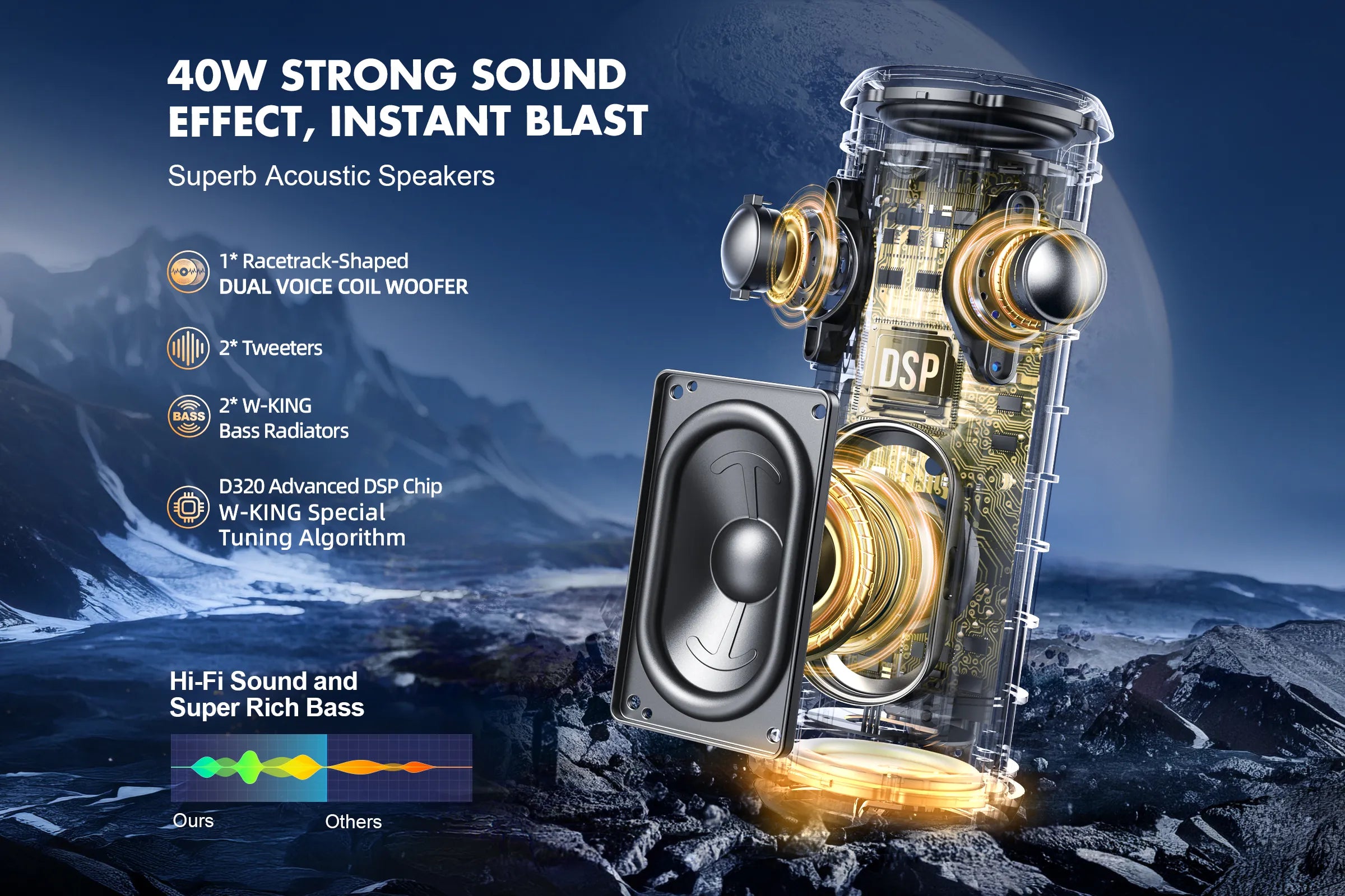 Great for workouts, movie nights, house parties and outdoor adventures alike, the W-KING D320 fits every moment. Premium hardware, deep bass and DSP tuning make it your ideal audio companion.